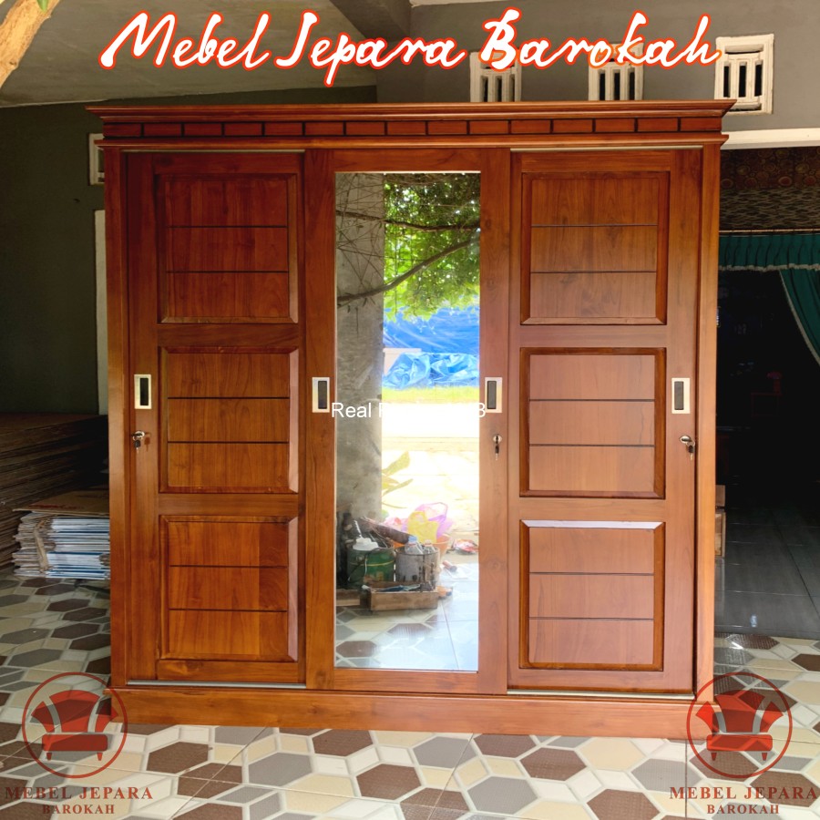 Lemari Pakaian 3 Pintu Sliding Kayu Jati Solid Minimalis dengan CerminLemari Pakaian 3 Pintu Sliding Kayu Jati Solid Minimalis dengan Cermin